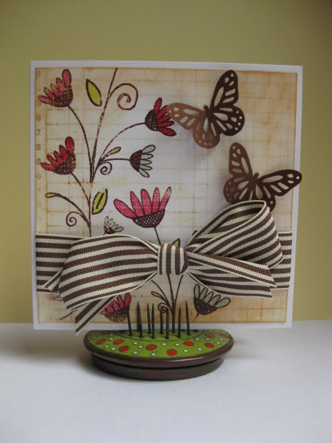 This last card is one that I made for a friend. I'd been waiting to get my sewing machine before finishing it off because this particular friend sews and I wanted to try and make her a card with stitching on it. It's a 3 x 3 mini card...